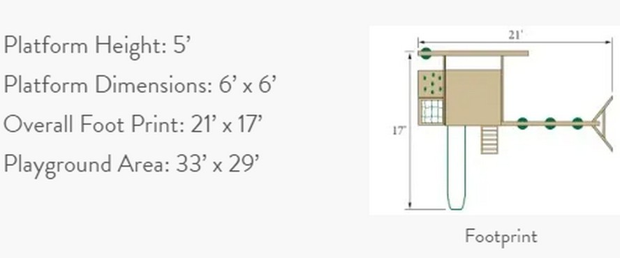 This playset has a 6'x6' tower with poly slats surrounding the 5' high platform, Our sky glider w/Cyclone seat is a fun way to go gliding across the back. For your climber, you will find a rockwall and cargo net on the side. On the front of the tower is your 10' Wonder Wave slide and 5' access ladder, On the 3 position, 8' high swing beam is 1 soft grip belt swing, 1 soft grip trapeze & our 2-person glider. Under the tower is a 3 chain tire swing on a swivel for spinning round and round. To top it all off is our heavy-duty tarp roof creating an excellent shady platform to hang out on.