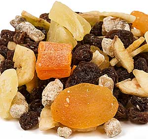 Ingredients: Flame Raisin (raisins, non-hydrogenated high-oleic sunflower oil), Dried Pineapple (pineapple, cane sugar, citric acid, sodium metabisulfite as sulphur dioxide (color preservative)), Dried Papaya (papaya, cane sugar, sodium metabisulfite as sulphur dioxide (color preservative), yellow #6), Chopped Dates (dates, oat flour), Sweetened Banana Chips (bananas, coconut oil, refined cane sugar, banana flavor), Sulphured Dried Apricots (dried apricots, sulphur dioxide (preservative)), Dried Apples (apples, sulfur dioxide).