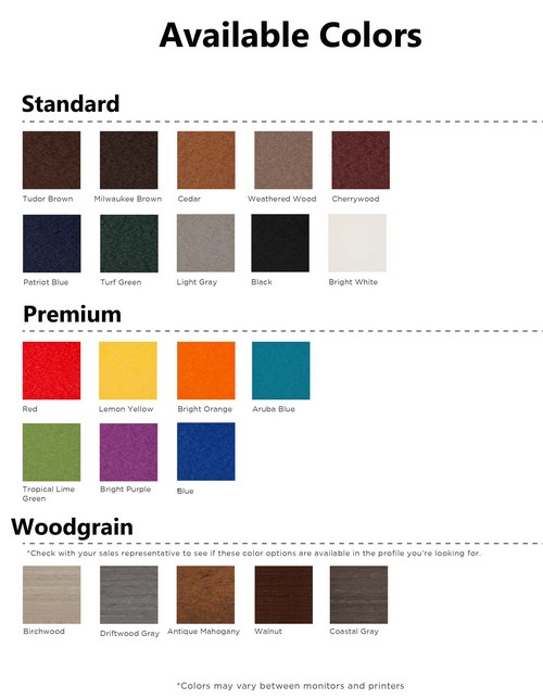 White, Black, Weatherwood, Light Gray, Partiot Blue, Turf Green, Blue, Milwaukee Brown, Cedar, White & Black, Cedar & Black, Weatherwood & Black, Cherrywood & Black, Aruba Blue & Black, Orange & Black, White & Blue, Ivory & Milwaukee Brown, Ivory & Cherrywood, Patriot Blue & Light Gray, Mahogany & Black, Birchwood & White, Driftwood Gray & Black.