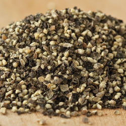 Pepper is the dried berry of a climbing vine that is native to India and Asia. Pepper is actually berries that are picked about nine months after flowering. Black Pepper, the spiciest, comes from berries that are picked unripe. This Coarse Ground Black Pepper contains large pieces of ground peppercorn and has a sharp, pungent aroma and flavor that is used as a universal table condiment to flavor all types of dishes. It is also commonly used in stocks, pickling and sausages.