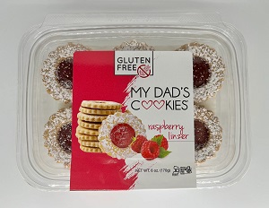 Ing: Gluten Free Flour (white rice flour, brown rice flour, potato starch, tapioca flour, xanthan gum), Raspberry Jam (Raspberries, sugar, fruit pectin, citric acid), Sugar, Organic Palm Oil, Powdered Sugar (Sugar, Corn Starch), Egg, Water, Vanilla, Agave Syrup, Cream of Tartar, Baking Powder (Sodium acid pyrophosphate, sodium bicarbonate, cornstarch, monocalcium phosphate), Salt, Baking Soda.
