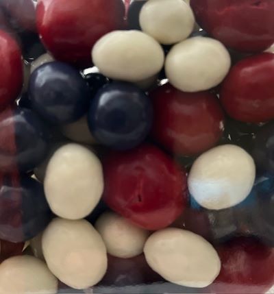 Sugar, Dried Cherries (Cherries, Sugar, Sunflower Oil), Dried Blueberries (Blueberries, Sugar, Sunflower Oil), Raisins (Raisins, Sunflower Oil), Powdered Sugar (Sugar, Cornstarch), Cocoa Butter, Whole Milk Powder, Chocolate Liquor, Nonfat Dry Milk Powder, Palm Kernel Oil, Cultured Whey, Nonfat Milk, Reduced Mineral Whey Powder, Whey Solids, Yogurt Powder (Cultured Whey and Nonfat Milk), Lactic Acid, Lactose, Soy Lecithin (an Emulsifier), Salt, Vanilla, Natural and Artificial Flavors, Gum Arabic, Confectioners Glaze, Tapioca Dextrin, Titanium Dioxide (Color), Red 40 Lake, Yellow 6 Lake, Blue 2 Lake, Red 3, Triacetin (Flavoring Agent).