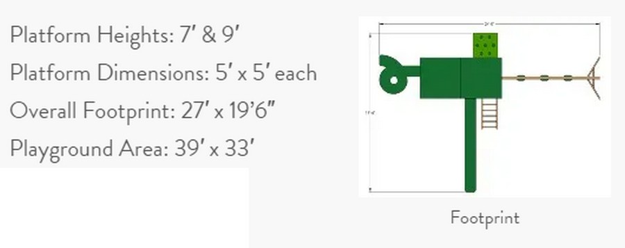 The Rambler Peak offers plenty of room to play with two large decks, a 7' high rock wall, 9’ tornado tube slide, 14' Avalanche Slide, 5’x5' Sandbox, two belt swings, and a glider.