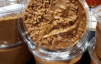 Cappuccino Peanut Butter Stock is made with dry roasted peanuts, butterscotch drops, cinnamon drops, instant coffee, dutch cocoa, cappuccino flavor, dextrose and soybean oil. This cappuccino peanut butter has a unique flavor with hints of cinnamon and cocoa that make it perfect for use on breads, cakes and cookies.