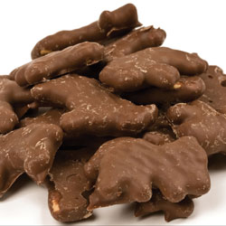 Ingredients: Confectionary Coating (sugar, palm kernel and palm oils, cocoa (processed with alkali), nonfat dry milk, dry whey (milk), soy lecithin (an emulsifier), vanilla), Animal Crackers (enriched flour (wheat flour, niacin, reduced iron, thiamine mononitrate (vitamin B1), riboflavin (vitamin B2), folic acid), sugar, soybean oil, high fructose corn syrup, Contains 2% or Less of: salt, natural flavor, corn starch, sodium bicarbonate (leavening), soy lecithin (an emulsifier), spices).