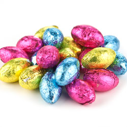 These solid bite sized chocolates have a festive egg shape and are individually wrapped in pastel foil, making them the perfect addition to Easter baskets and gift bags.