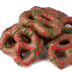 Ingredients: Confectionery Coating (sugar, hydrogenated palm kernel oil, cocoa powder, whey powder, nonfat milk powder, soy lecithin (an emulsifier), vanilla), Pretzels (enriched wheat flour (wheat flour, niacin, reduced iron, thiamine mononitrate, riboflavin, folic acid), salt, corn syrup, sodium bicarbonate, yeast), Yogurt Flavored Coating (sugar, palm kernel oil and/or palm oil, nonfat dry milk, whey powder, nonfat yogurt powder (cultured whey, nonfat milk), titanium dioxide (color), soy lecithin (an emulsifier), lactic acid, vanilla), Artificial Coloring (includes yellow 5 lake, blue 1 lake, red 40 lake, blue 2 lake).