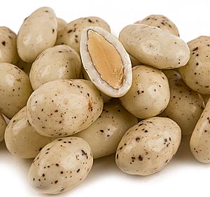 Ingredients: Confectionery Coating (sugar, vegetable oil (palm kernel and palm oils), whey, milk, soy lecithin (an emulsifier), natural vanilla flavor), Almonds, Coffee Beans, Water, Gum Arabic, Confectioners Glaze, Modified Starch (tapioca), Coconut Oil.