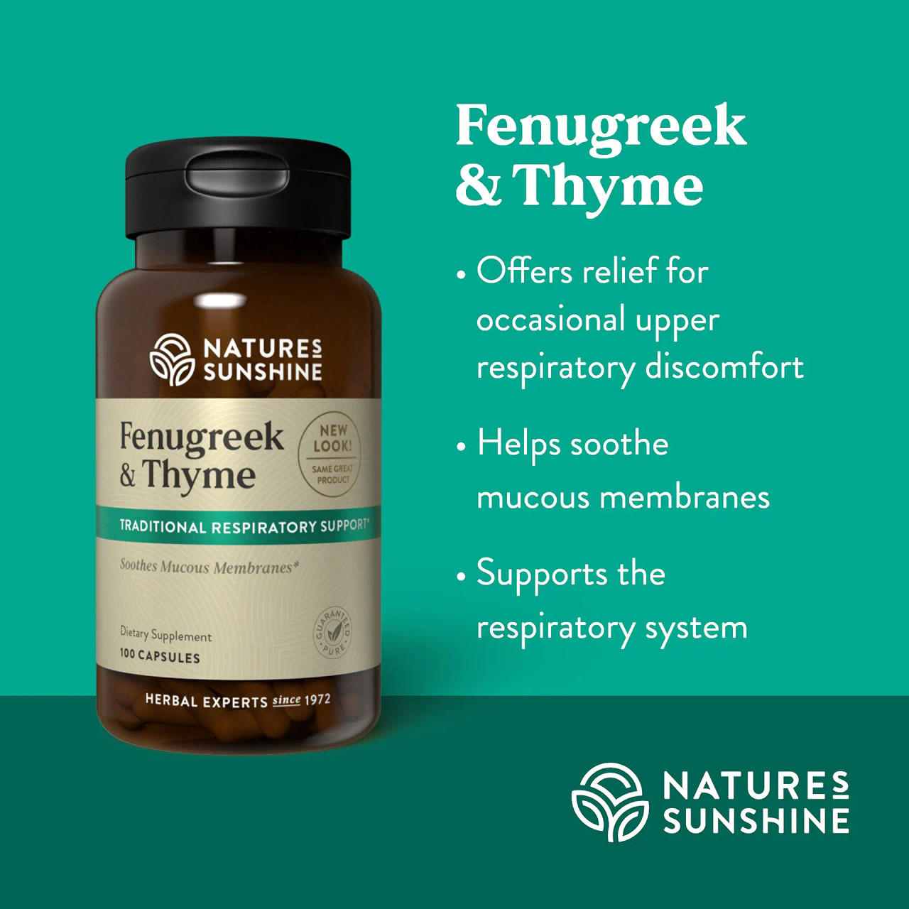 Fenugreek & Thyme [Respiratory]. Fenugreek herb contains mucilaginous compounds, which are gel-like substances known for their ability to help support tissues. It is also an herbal source of selenium, an important trace mineral that also functions as an antioxidant. Historically, thyme has been used to support respiratory health.