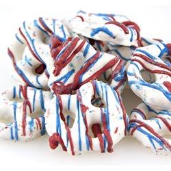 Ingredients: Yogurt Flavored Coating (sugar, palm kernel oil and/or palm oil, nonfat dry milk, whey powder, nonfat yogurt powder (cultured whey, nonfat milk), titanium dioxide (color), soy lecithin (an emulsifier), lactic acid, vanilla), Pretzels (enriched wheat flour (wheat flour, niacin, reduced iron, thiamine mononitrate, riboflavin, folic acid), salt, corn syrup, sodium bicarbonate, yeast), Artificial Coloring (includes blue 1 lake, blue 2 lake, red 40 lake).