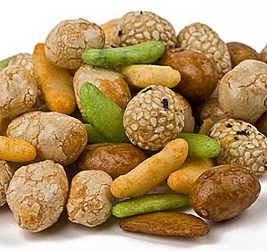 Ingredients: Rice, peanuts, wheat flour, sugar, sesame seeds, soy sauce (water, salt, soybeans, wheat), modified tapioca starch, palm oil, seaweed, ammonium bicarbonate, corn starch, potato starch, chili seasoning (salt, sugar, whey powder, chili powder, paprika oleoresin), BBQ seasoning (salt, sugar, ginger powder, chili powder, black pepper, garlic powder, onion powder, aniseed powder, citric acid, soy sauce powder, dextrin), wasabi powder, chili powder, paprika oleoresin, caramel color, curcmin, FD&C yellow #5, FD&c blue #1.