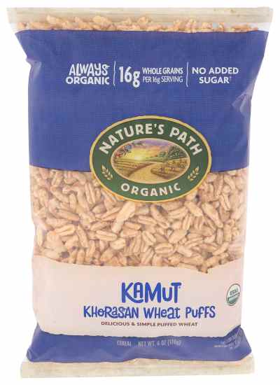 Nature's Path Puff Kamut Cereal is made from whole grains Kamut Khorasan wheat that is sodium free, has no added sugar and is kosher and vegan. It is USDA Organic certified, grown without chemical herbicides and pesticides. The product includes one 6 oz. bag. See nutrition facts panel for allergens.