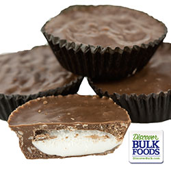 Old fashion classic candy everyone loves. Unwrapped mallo cups have a whipped cream center and are covered with pure milk chocloate. Each piece is placed in a paper cup no wrapping.
