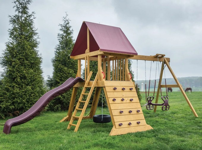 Unlike any other playset tower, the Olympus has its legs at an angle, creating a unique space for a tire swing underneath and climbing features on the legs.