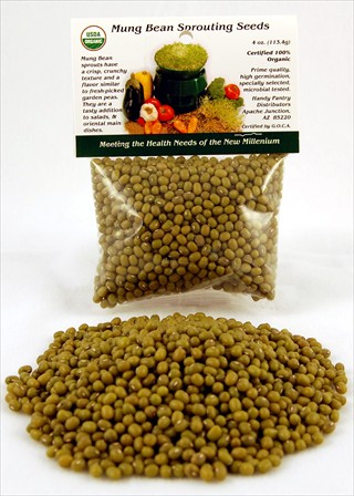 Organic Mung Seed is Excelent for sprouts & sprouting, food storage, soup, cooking & garden seed. Mung bean seeds are one of our most popular sprouting seed / beans. Organic Mung Beans Sprouts are rich in protein as well as vitamin A, the vitamin B complex, vitamin C and vitamin E, as well as various minerals and enzymes. Sprouts from Organic Mung beans are Said often to protect against cancer, fatigue and can assist in building the immune system. Organic Mung Seed Sprouts are Highly recommended! Calories in Beansprouts, Alfalfa Sprouts: 1 Cup = 10 calories. One pound of Mung Beans Seeds make about 10 pounds of Organic mung beans sprouts. Organic Mung bean sprouts have a crisp, crunchy texture and a flavor similar to fresh-picked garden peas.