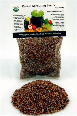 Organic Radish Sprout Mix: Radish sprouts are high in vitamins A, B-1, B-6 and C, folic and pantothenic acids, niacin, potassium, iron and phosphorous. When the organic radish sprout is exposed to light, they turn light green with chlorophyll. These radish sprouts sprout well with other seeds and make a spicy addition to any vegetable dish. Organic radish sprout offer Vitamins A, B, C, E and K Calcium, Iron, Magnesium, Phosphorus, Potassium, Zinc Carotene, Chlorophyll Amino Acids Trace Elements Antioxidants Radish Sprouts Protein: 35% This Radish Sprouts Mix is Perfect For: