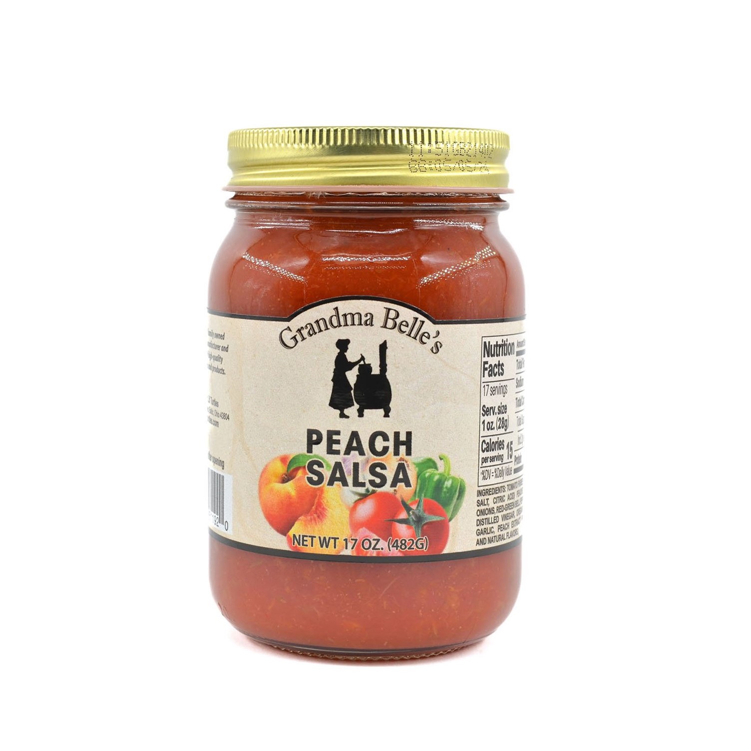 Ingredients: Tomato Puree (Water, Tomatoes, Salt, Citric Acid), Peaches (Sugar, Water) Onions, Red-Green Bell Peppers, Sugar, White Distilled Vinegar, Oregano, Salt, Cayenne, Garlic, Peach Extract (Propylene Cyclol and Natural Flavors).