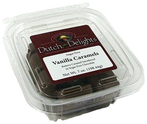 Ingredients: Sugar free milk chocolate flavored coating (maltitol, chocolate liquor, cocoa butter, sodium caseinate [milk], milk fat, soy lecithin [emulsifier], vanillin [artificial flavor], vanilla, salt, sucralose), lycasin, butter (cream, salt), water, cream powder (cream, milk solids, sodium caseinate, mono- and diglycerides, sunflower lecithin, sodium citrate, fumed silica, TBHQ), no sugar added milk chocolate flavored coating (maltitol [sweetener], hydrogenated vegetable fat [palm kernel and/or palm], cocoa powder processed with alkali, glyceryl-lacto esters of fatty acids, milk fat, soy lecithin [emulsifier], titanium dioxide color, vanillin [artificial flavor]), soy lecithin, baking soda (sodium bicarbonate), vanillin (artificial flavor), caramel flavor (natural and artificial flavors, propylene glycol, caramel color).