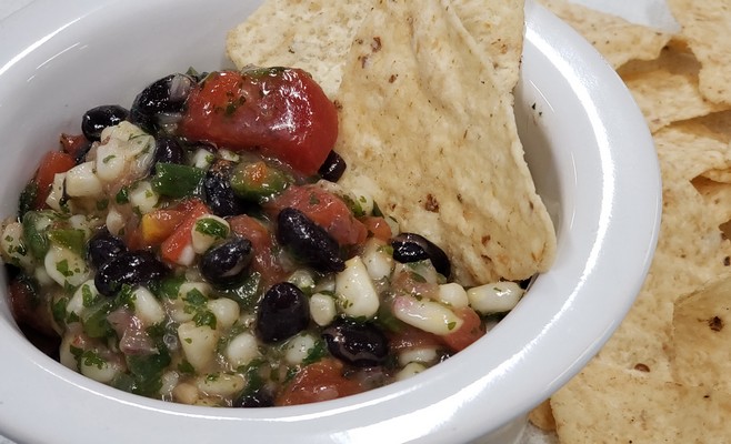 Ingredients: White Corn, Black Beans, Plum Tomatoes, Zesty Italian Dressing (Soybean Oil, Vinegar, Water, Salt, Sugar, Less than 2% Lemon Juice, Garlic, Spices, Maltodextrin, Onion, Xanthan Gum, Carrots, Red Bell Pepper, Propylene, Glycol Alginate, Yeast Extract, Natural Flavor, Calcium Diosodium, EDTA, Annatto, Paprika, Sunflower Oil, Caramel), Red and Green Onion, Cilantro, Jalapeno Peppers.