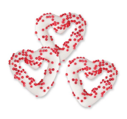 Ingredients: Confectionery Coating (sugar, palm kernel and palm oil, reduced mineral whey powder, nonfat dry milk, whey powder sorbitan monostearate, polysorbate 60, soy lecithin [emulsifier], vanillin [artificial flavoring]), Pretzel (enriched wheat flour [wheat flour, niacin, reduced iron, thiamin mononitrate, riboflavin, folic acid], salt, vegetable oil [may contain one or more of the following {canola, corn, soybean}], corn syrup, sodium bicarbonate, yeast), Nonpareils (sugar, corn starch, red 3, red 40, carnauba wax, confectioner's glaze).Contains milk, soy, wheat.Made on shared equipment. May contain peanuts, sesame and tree nuts.